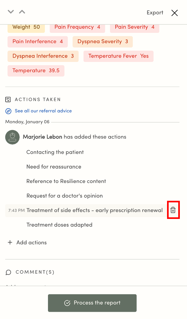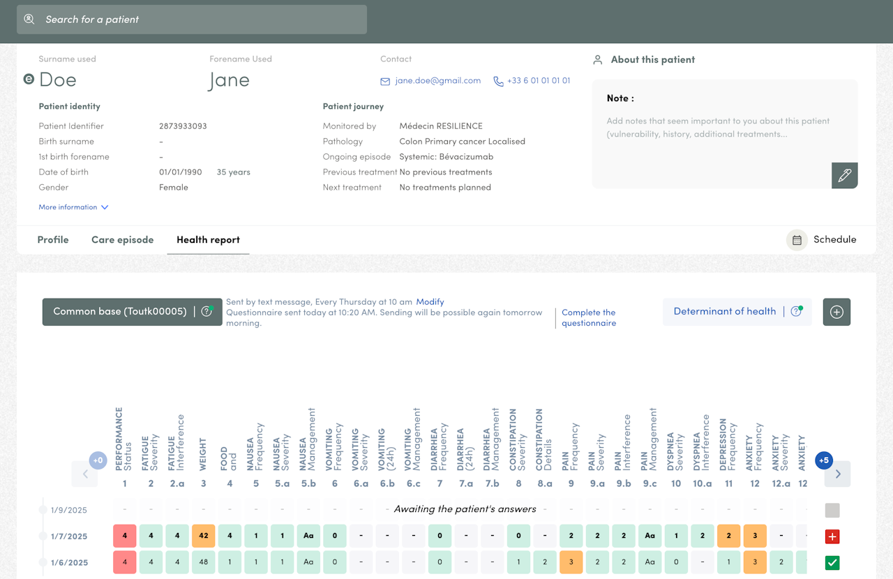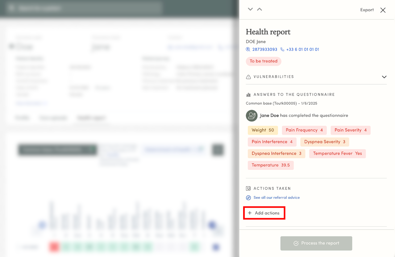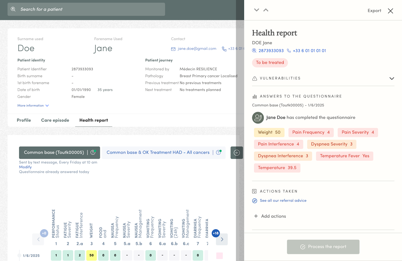 You can still find the processed questionnaire and the actions performed by consulting the patient’s health report in their file (see Accessing the health report).