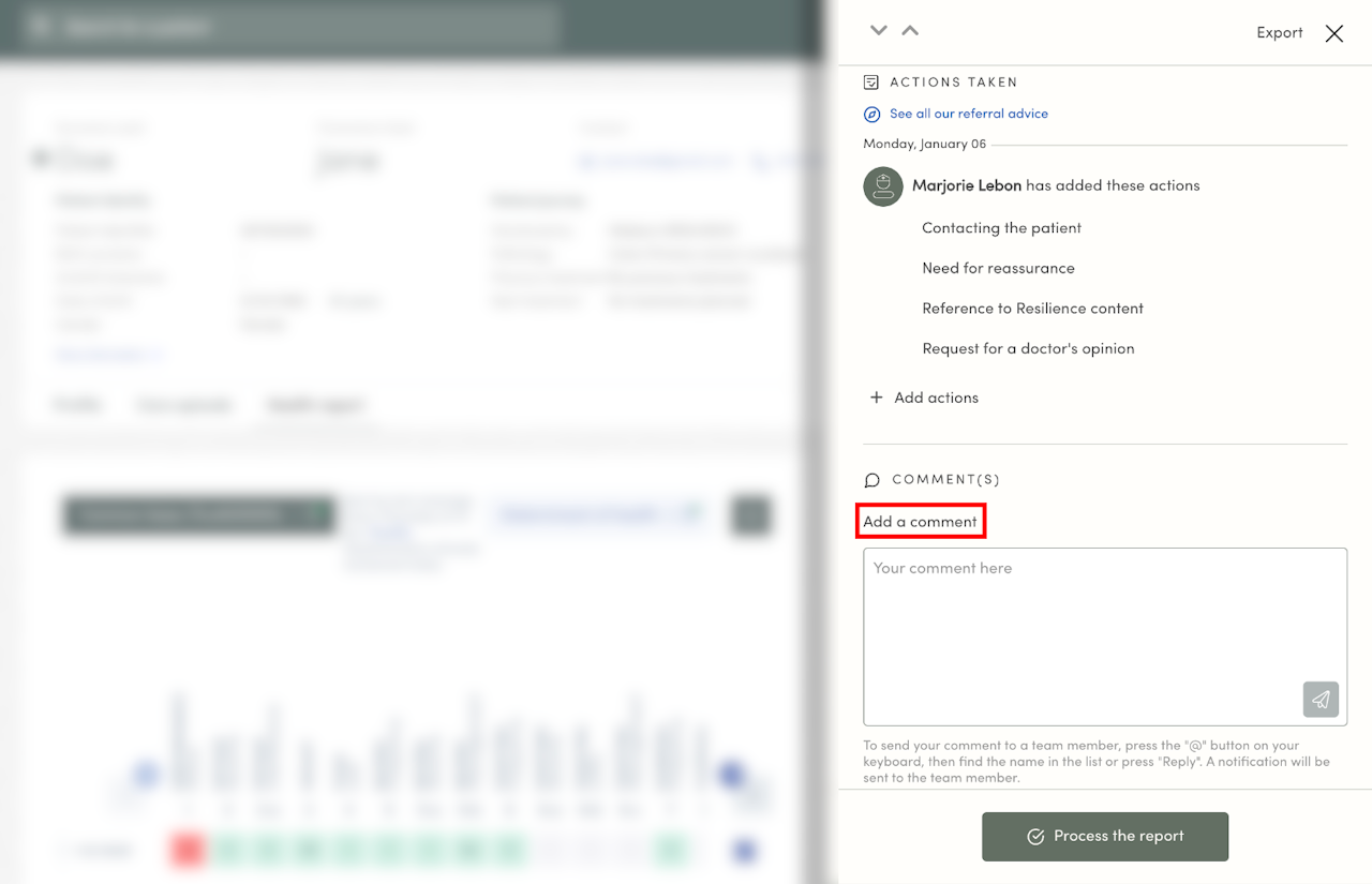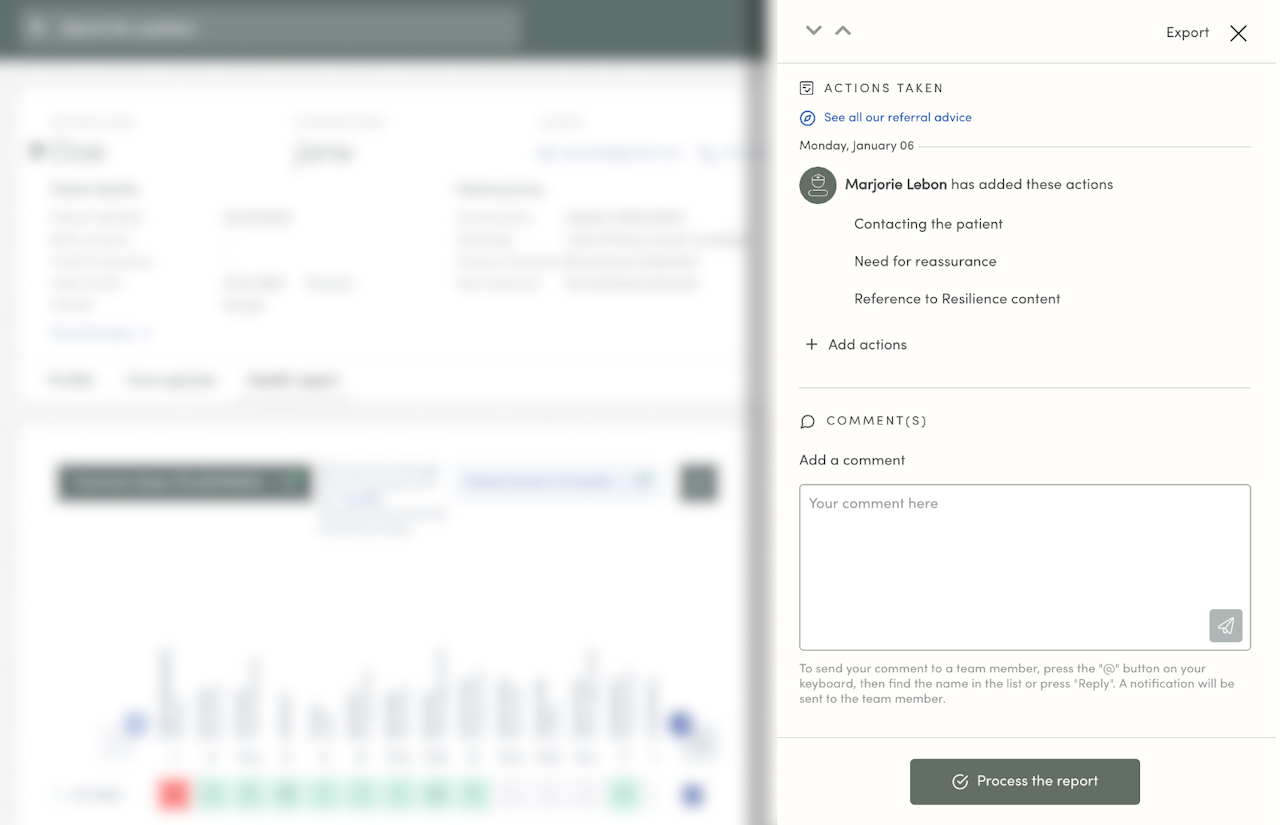 On this tab, when you click on the alert of the patient you want to process, you access the “Health report” page for that patient.