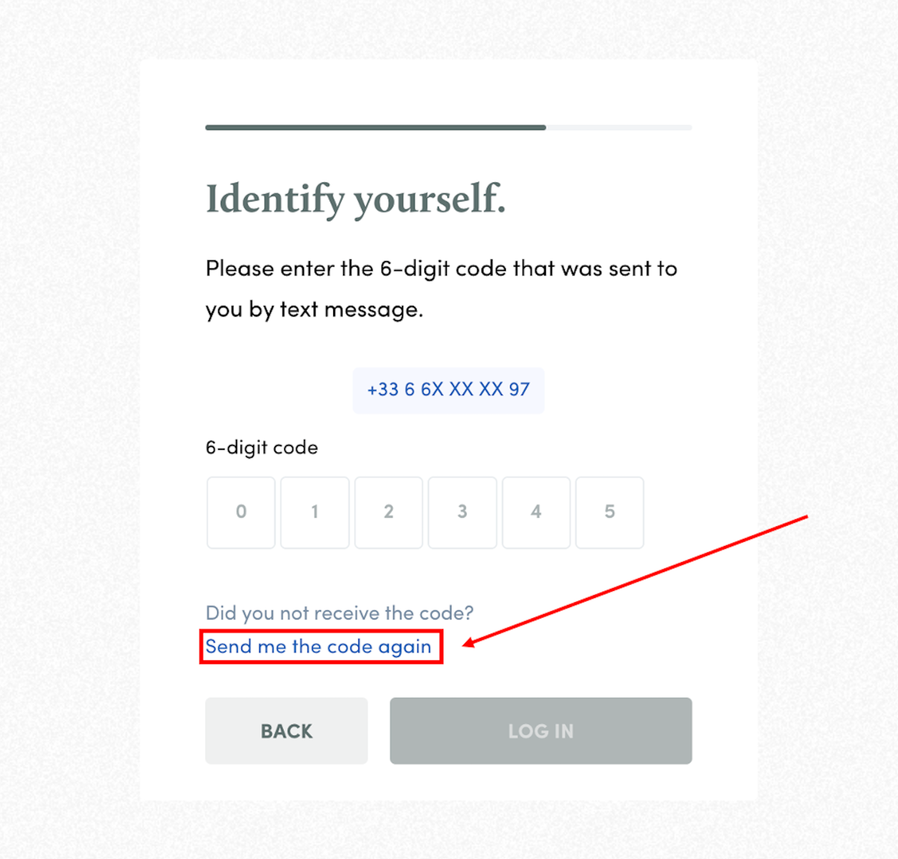When you log in to your account, if you do not receive the 6-digit code sent by text message on your mobile phone, you can resend it by clicking on “Send me the code again”.