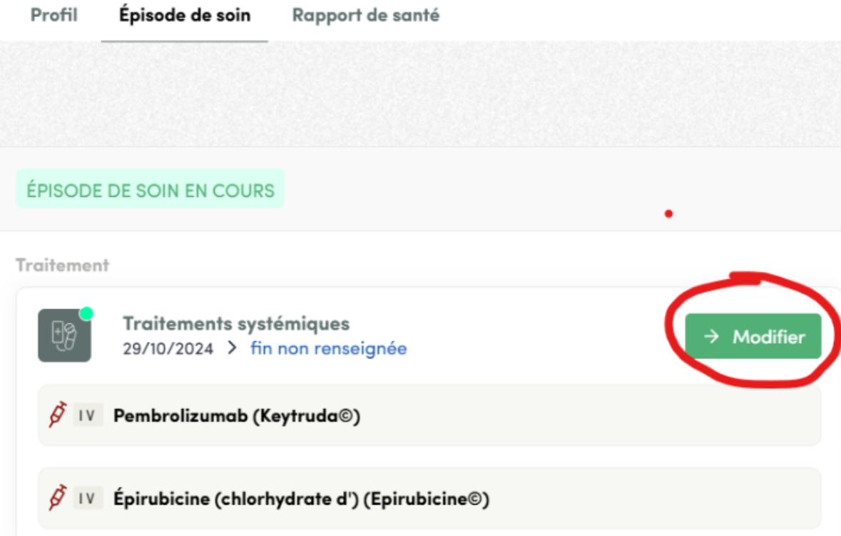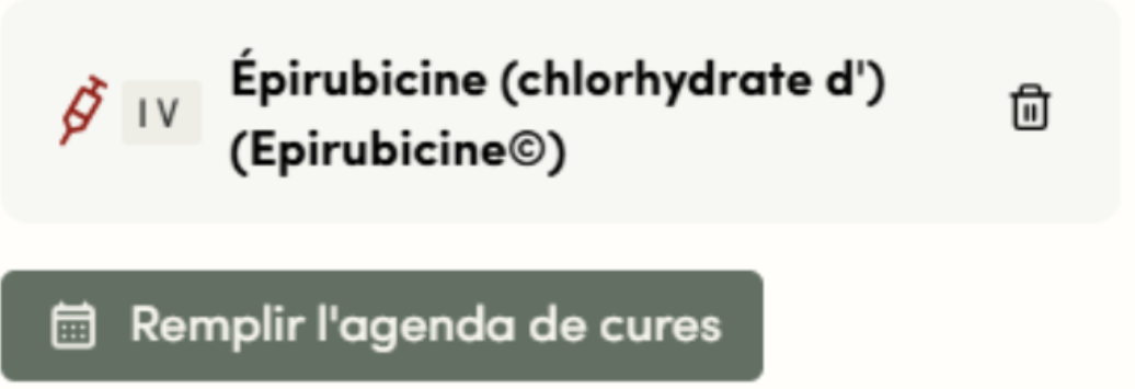 Vous pouvez renseigner les cycles de cures de vos patients en accédant à Épisode de soins > Modifier au niveau du protocole > Remplir l’agenda de cures.