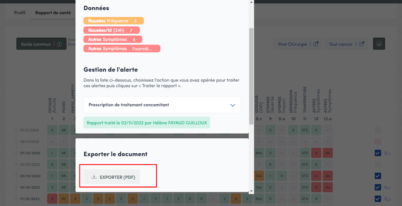 Il est aussi possible d’exporter le rapport de santé, à partir de l’onglet “Alertes” sur le bandeau de gauche, en cliquant sur la ligne du patient pour lequel le questionnaire est en alerte.