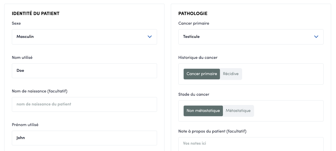 Dans la section ‘Pathologie’ du profil patient, vous pouvez qualifier le cancer en indiquant l’historique (cancer primaire ou récidive) et le stade du cancer (métastatique ou non métastatique). Sans action de votre part, le cancer sera qualifié de primaire et non métastatique.