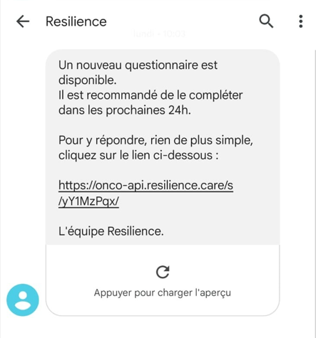 Prenez connaissance du SMS Resilience envoyé sur le smartphone du patient, et cliquez sur le lien, pour l’ouvrir dans l’application Resilience.